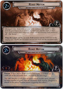 Type: Quest Encounter Set: We Must Away, Ere Break of Day Encounter Info: Western Lands Quest Points: 1 When Revealed: Add the set-aside Troll enemies and the Troll Cave to the staging area. Shuffle the encounter discard pile back into the encounter deck. Forced: If there are no Troll enemies left in play, or if there are no cards left in the encounter deck, advance it to the next stage. Any time players would place progress tokens on this quest, discard an equal number of cards from the encounter deck instead. (Progress is placed on the active location before triggering this effect.) Obviously trolls. Even Bilbo, in spite of his sheltered life, could see that: from the great heavy faces of them, and their size, and the shape of their legs, not to mention their language, which was not drawing-room fashion at all - The Hobbit Set: OHaUH Number: 24 Quantity: 1 Illustrator: Derek Zabrocki |