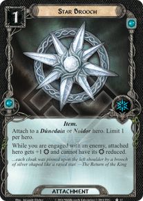 Type: Attachment Sphere: Spirit Cost: 1 Item. Attach to a Dúnedain or Noldor hero. Limit 1 per hero. While you are engaged with an enemy, attached hero gets +1 [Willpower] and cannot have its willpower reduced. ...each cloak was pinned upon the left shoulder by a brooch of silver shaped like a rayed star. -The Return of the King Set: The Lost Realm Number: 13 Quantity: 3 Illustrator: Alexandr Elichev |